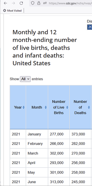 [5] US Centers for Disease Control and Prevention. National Vital Statistics System. State and national provisional counts. Monthly and 12-month ending number of live births, deaths and infant deaths: United States. https://www.cdc.gov/nchs/nvss/vsrr/provisional-tables.htm