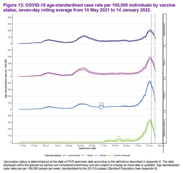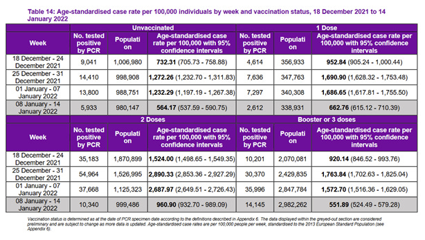 In Scotland also, among those who had received one, two or three vaccines, or none at all, the unvaccinated had the lowest case rates in January 2022 of all four groups, as seen in this table [27] and graph. [28]