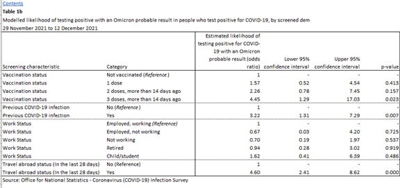 Data from the UK government, Office for National Statistics, had shown that each successive vaccine dose had increased the likelihood of testing positive for the Omicron variant, showing negative vaccine efficacy, as in the table below, [24] which is not always consistent with data reported by UK government’s Health Security Agency. [25] One must click through to the Excel file to see the following table.