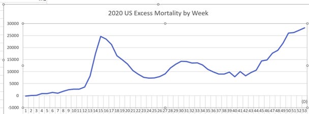 Data released by the Organisation for Economic Cooperation and Development (OECD) show that each of those last three weeks of 2020 in December 2020 excess deaths (number of deaths over those expected) had higher excess deaths than any of the previous weeks of the alleged pandemic. [3] Each of those last three weeks of December 2020 exceeded 25,000 excess deaths per week, whereas even the worst COVID hospitalization weeks, the first two weeks of April 2020, did not exceed 25,000 excess deaths per week.