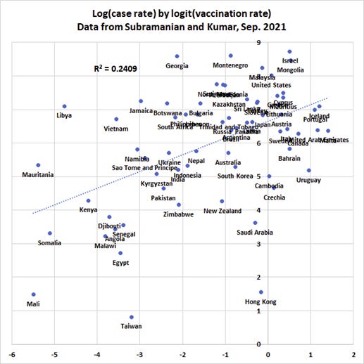 Switkay showed that Subramanian and Kumar’s trend line regarding relation between new COVID cases and vaccination is not only positive, but “ . . . indeed, there is a very strong positive association.” [13]