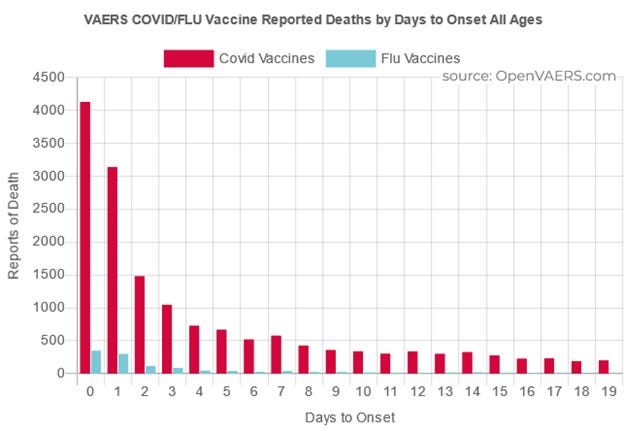 It can be seen from the CDC data, that the deaths per week in the US in each of the first seven weeks following the Pfizer and Moderna rollout all exceeded even the deadliest weeks of 2020 (the two weeks ending April 11 and April 18 of 2020). [5] This should be enough to make anyone hesitant about the vaccines, and logically, more fearful of the vaccines than of COVID.