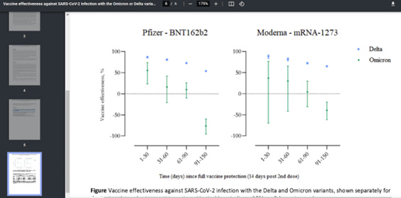 This Danish study [22] showed that both Pfizer and Moderna COVID vaccines showed negative efficacy against the Omicron variant within only 90 days of administration, and that that decline in efficacy was even faster for Omicron than for the earlier Delta variant. This sharp decline is illustrated in the following graph.