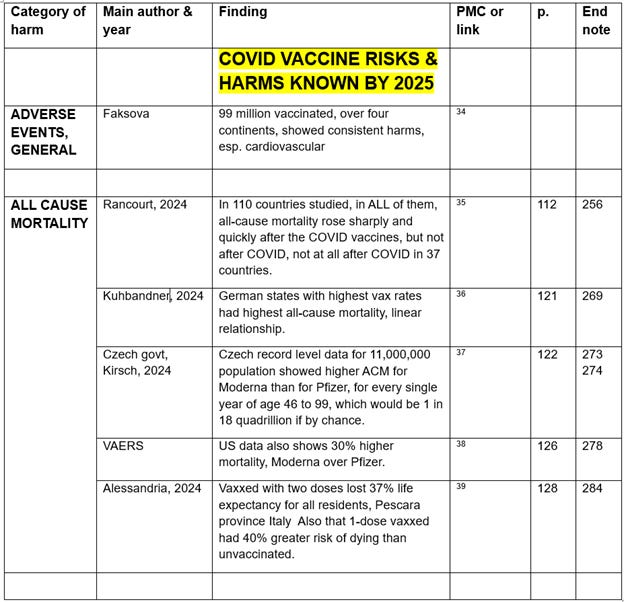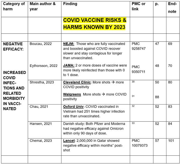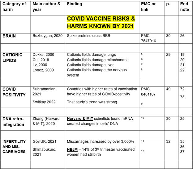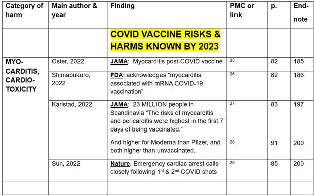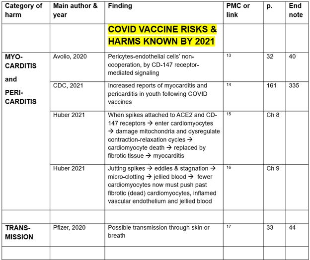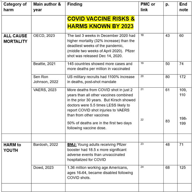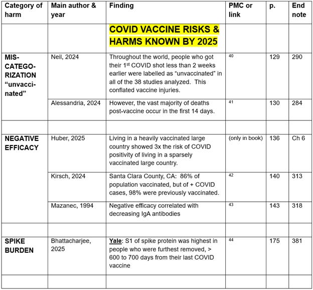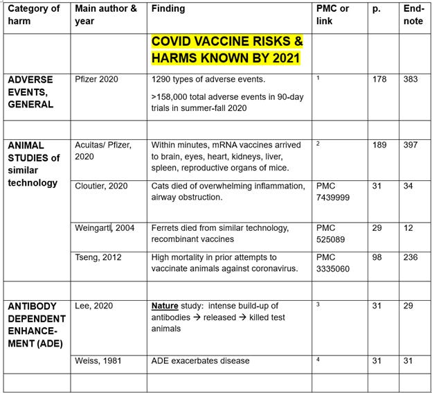 But both print and e-book formats are cumbersome for looking up cited studies. So the following tables show a sampling, with links below, of a few dozen of the more than 1,000 studies cited in the book that may be useful regarding what was known about the COVID vaccine risks, and when each of the major danger signals became known.